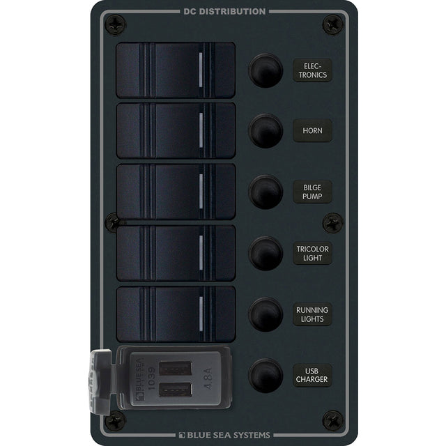 Blue Sea 8521 - Panel de interruptores Contura de 5 posiciones con cargadores USB duales - 12/24 V CC - Negro [8521] 1.4 lb