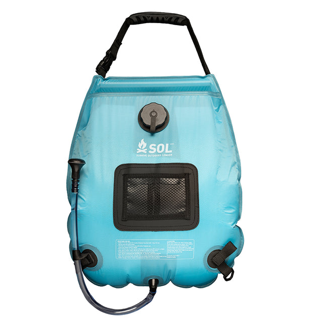 Hang above you with the rugged handle and buckle. Store toiletries and a mirror in the front mesh pocket for easy access during your shower. The flow-control shower head gives you the choice of water pressure. Make base camp feel like home with the SOL Solar Shower.