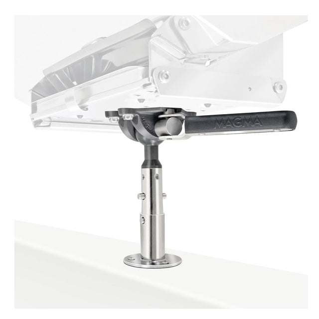Este soporte de acero inoxidable pulido espejo 18-8 y aluminio anodizado duro cuenta con el soporte de bloqueo ajustable en todos los ángulos LeveLock de Magma, un pasador de bloqueo con botón pulsador y un orificio de drenaje de agua en el costado del enchufe.