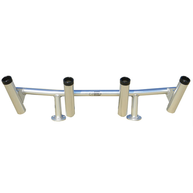 From catfishing to trolling for big game, our stout four-rod rocket launcher was built to handle demanding fish. Its universal design allows for just about any mounting location you can think of. The two outer holders shoot away from the center approximately 15° and  down approximately 10°. The two inside holders shoot straight back.